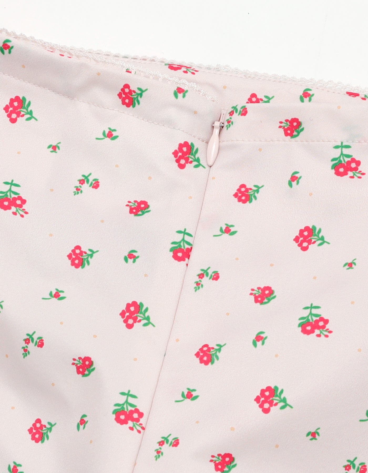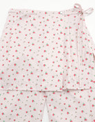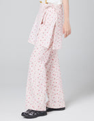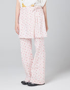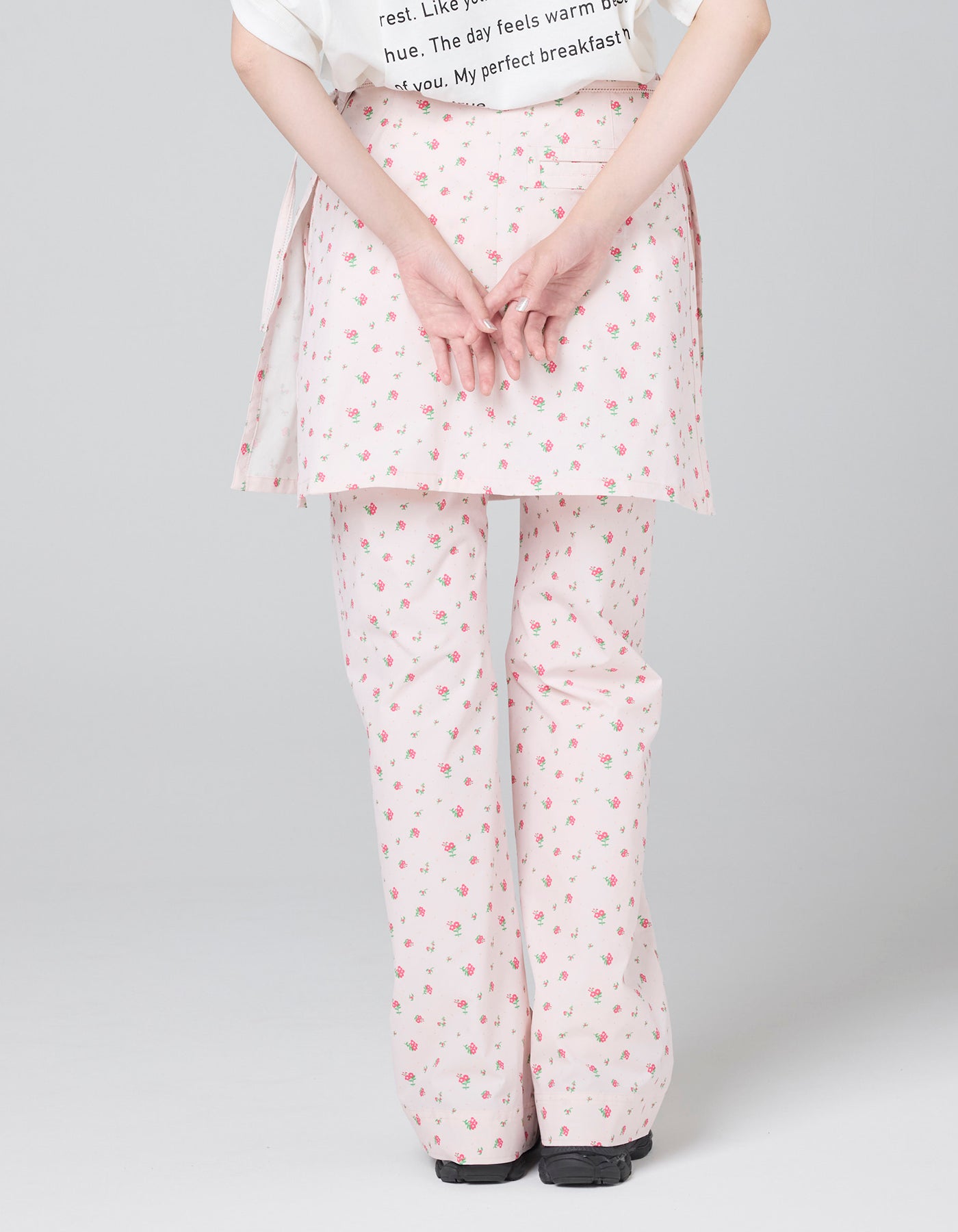 総柄の小花プリントが映えるナイロンパンツ。アイテムはパンツですが、ラップスカートがドッキングされています。軽くて動きやすく、ヒップラインが隠せるのも○。少し腰に落としてルーズシルエットでの着用も抜け感が出ます。同じ小花柄アイテムとのセットアップもおすすめです。