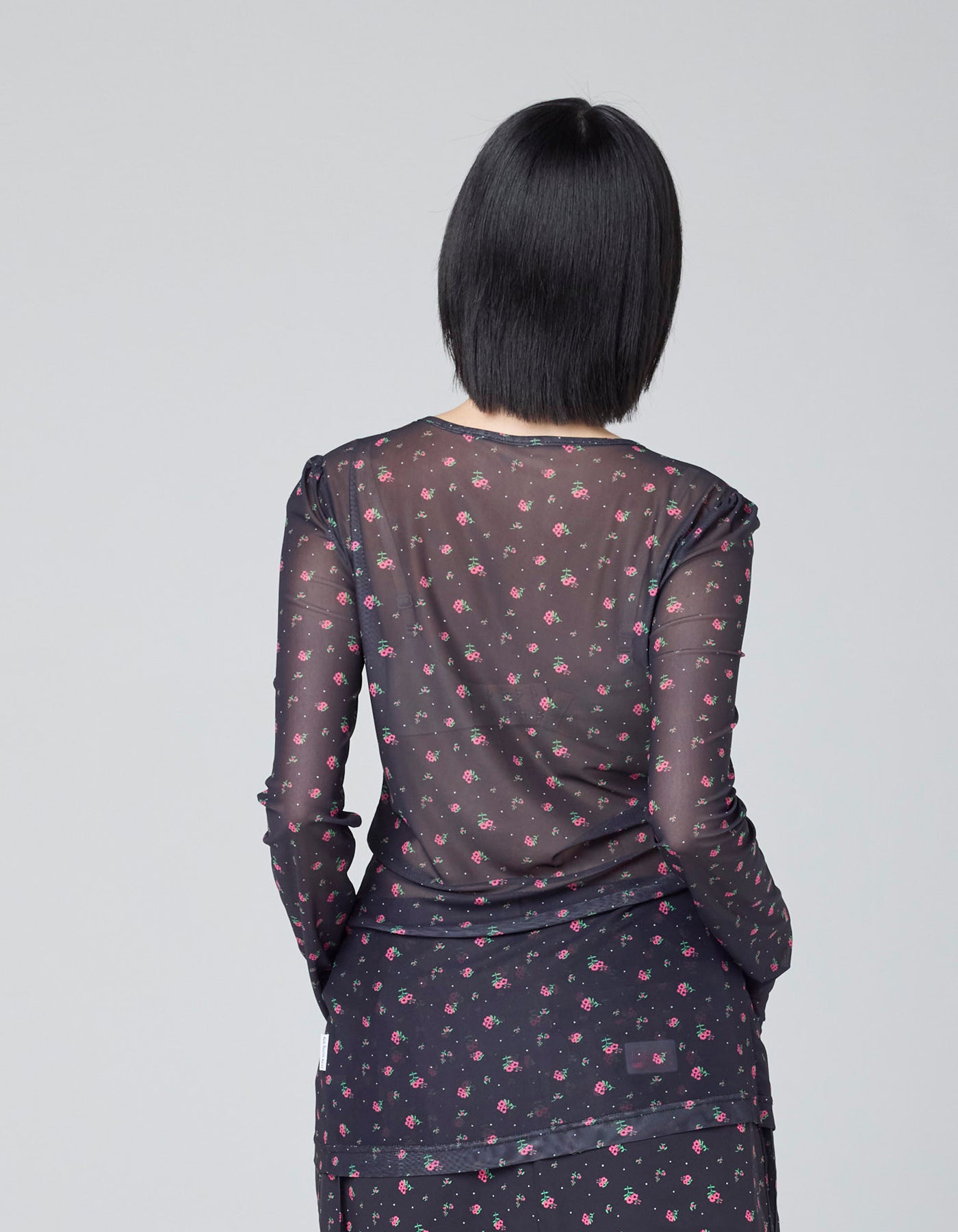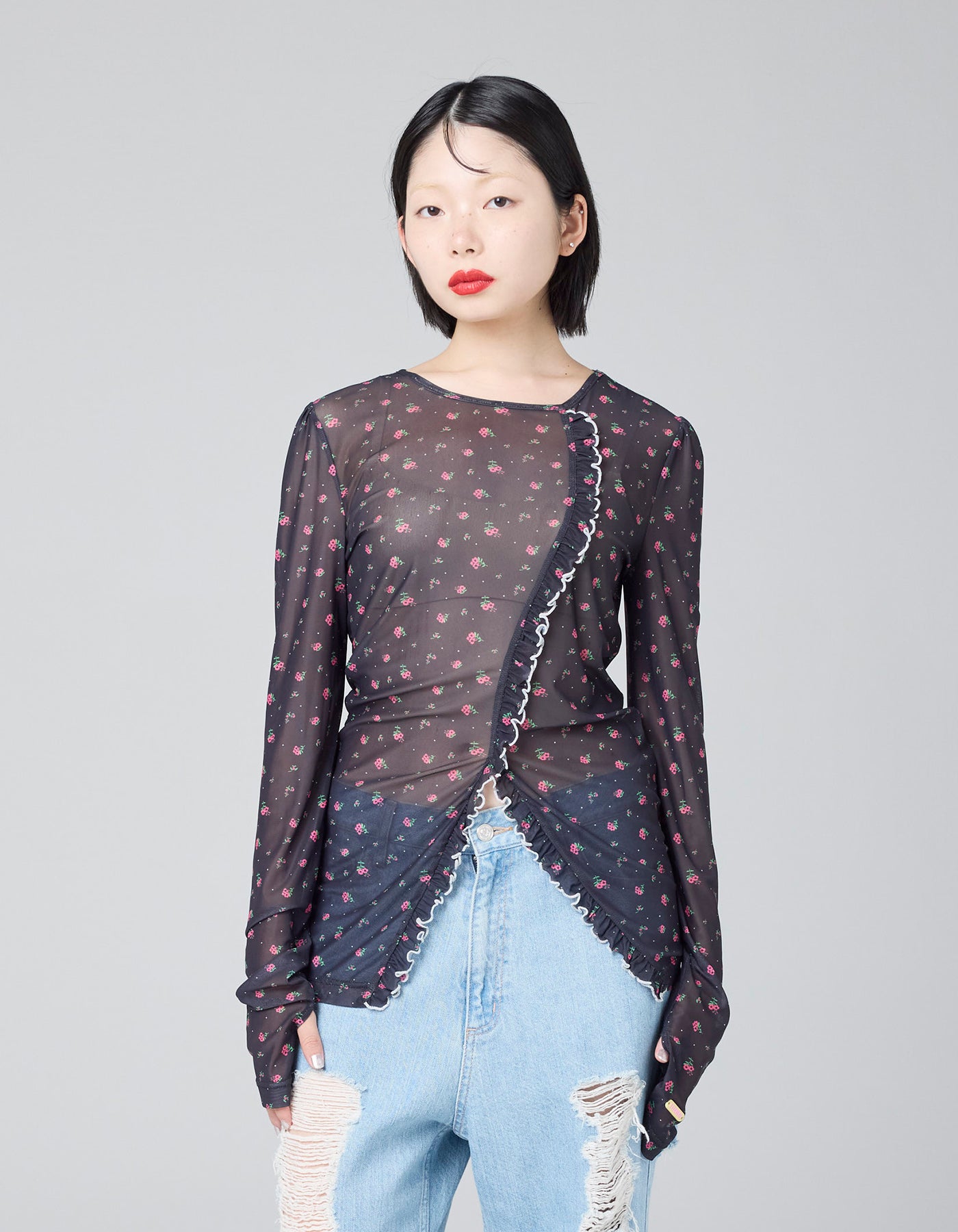 軽やかなチュールと小花柄を組み合わせた万能なシアートップス。体に沿うフィット感と透明感のある生地に、アシンメトリーデザインがレイヤードの幅を広げてくれます。袖口のサムホール仕様は、手元まで包み込むデザインで、レイヤードとアクセントを兼ね備えています。