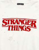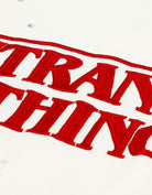 フロントにSTRANGER THINGSロゴを大胆に配置した刺繍スウェットトップス。