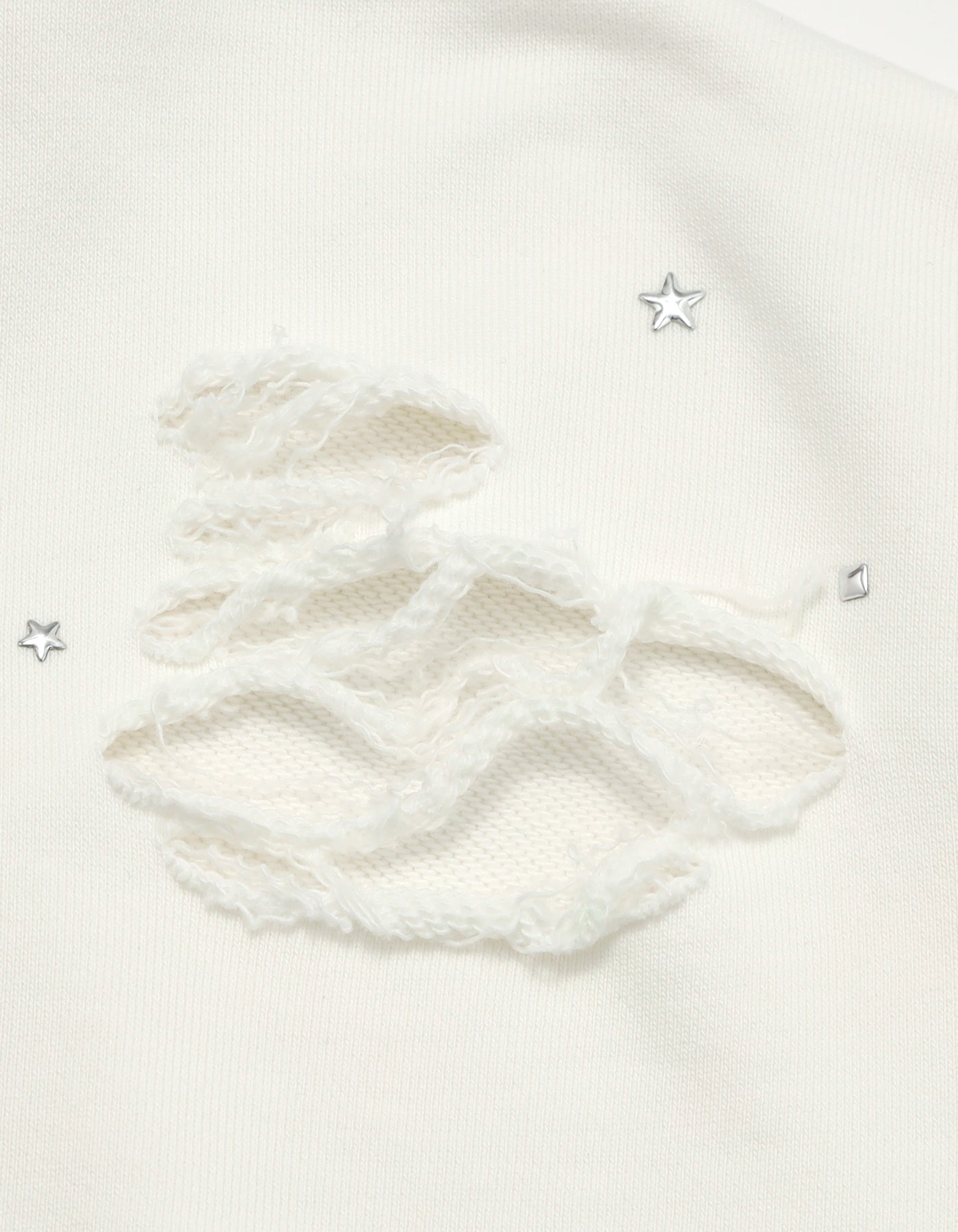 ウォッシュ加工でヴィンテージライクな色合いのグラデーション(白はほぼ分からない)と、大胆なダメージ加工と星型のスタッズがついているのもポイント。
