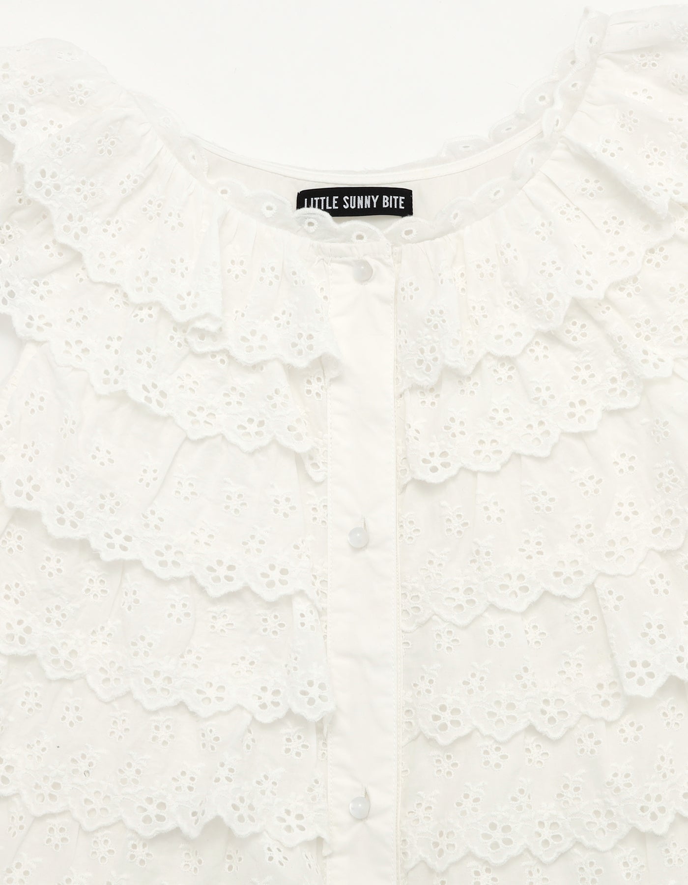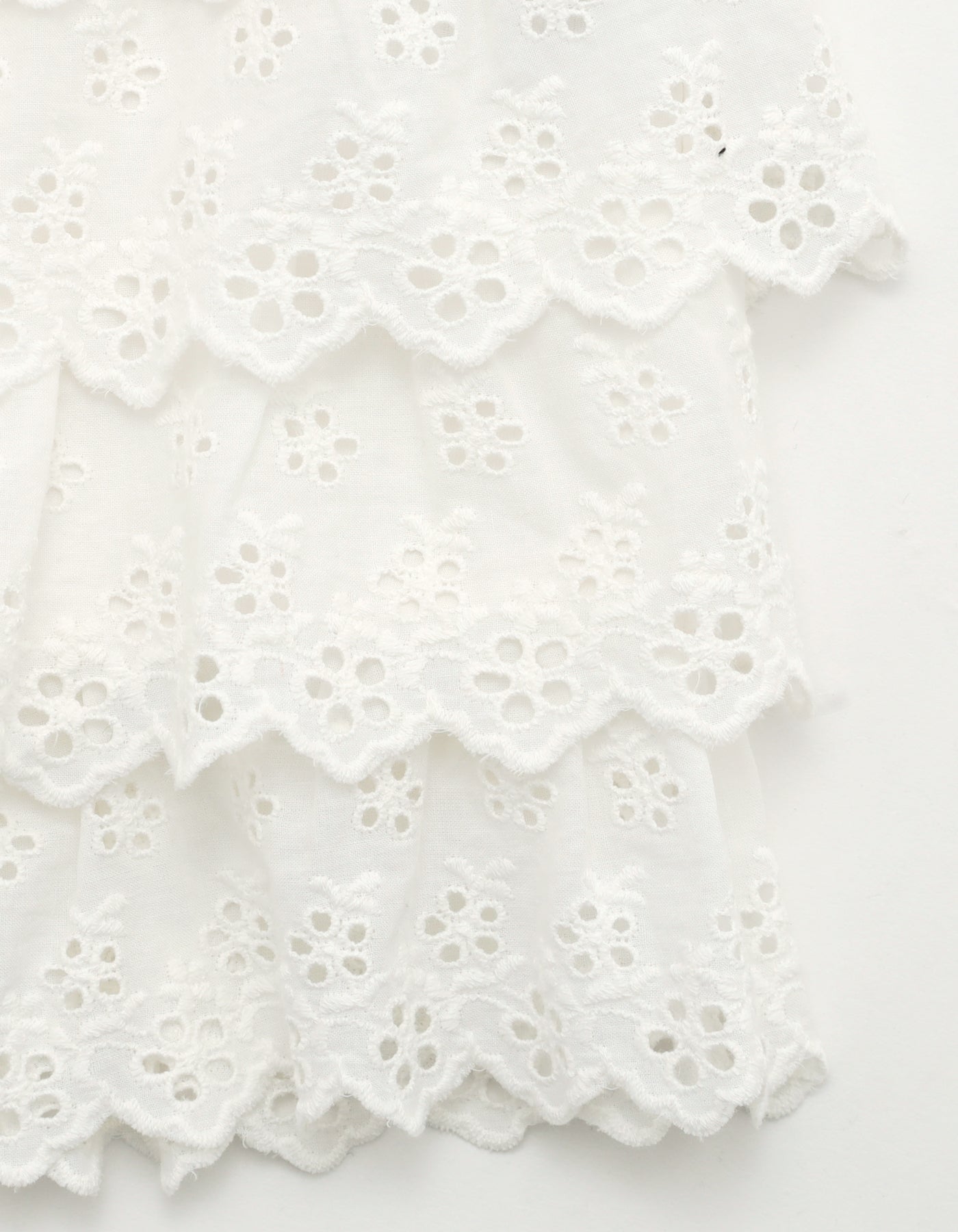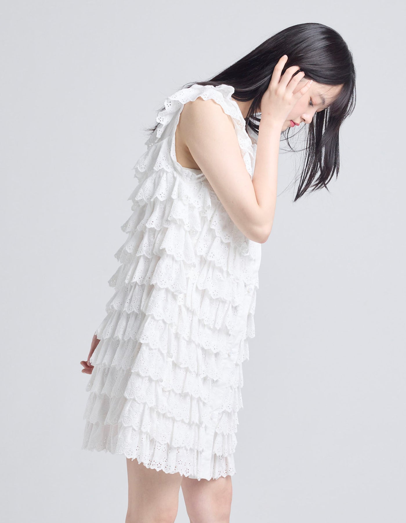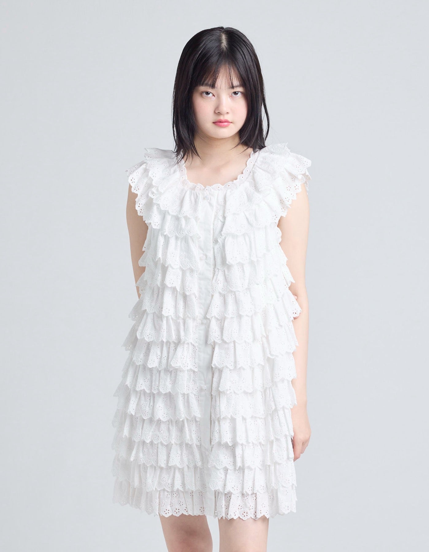 This tiered dress is made with floral lace and can be fastened and detached with buttons on the front. It can be coordinated with a variety of innerwear and bottoms.