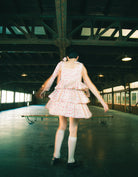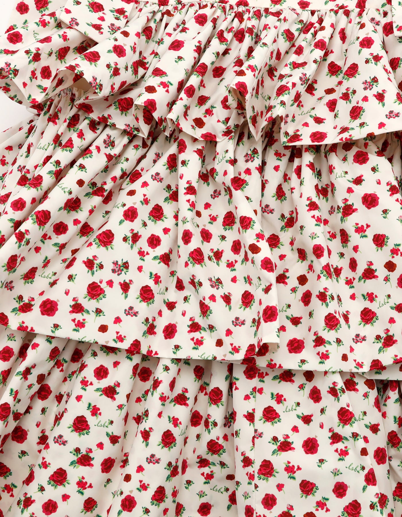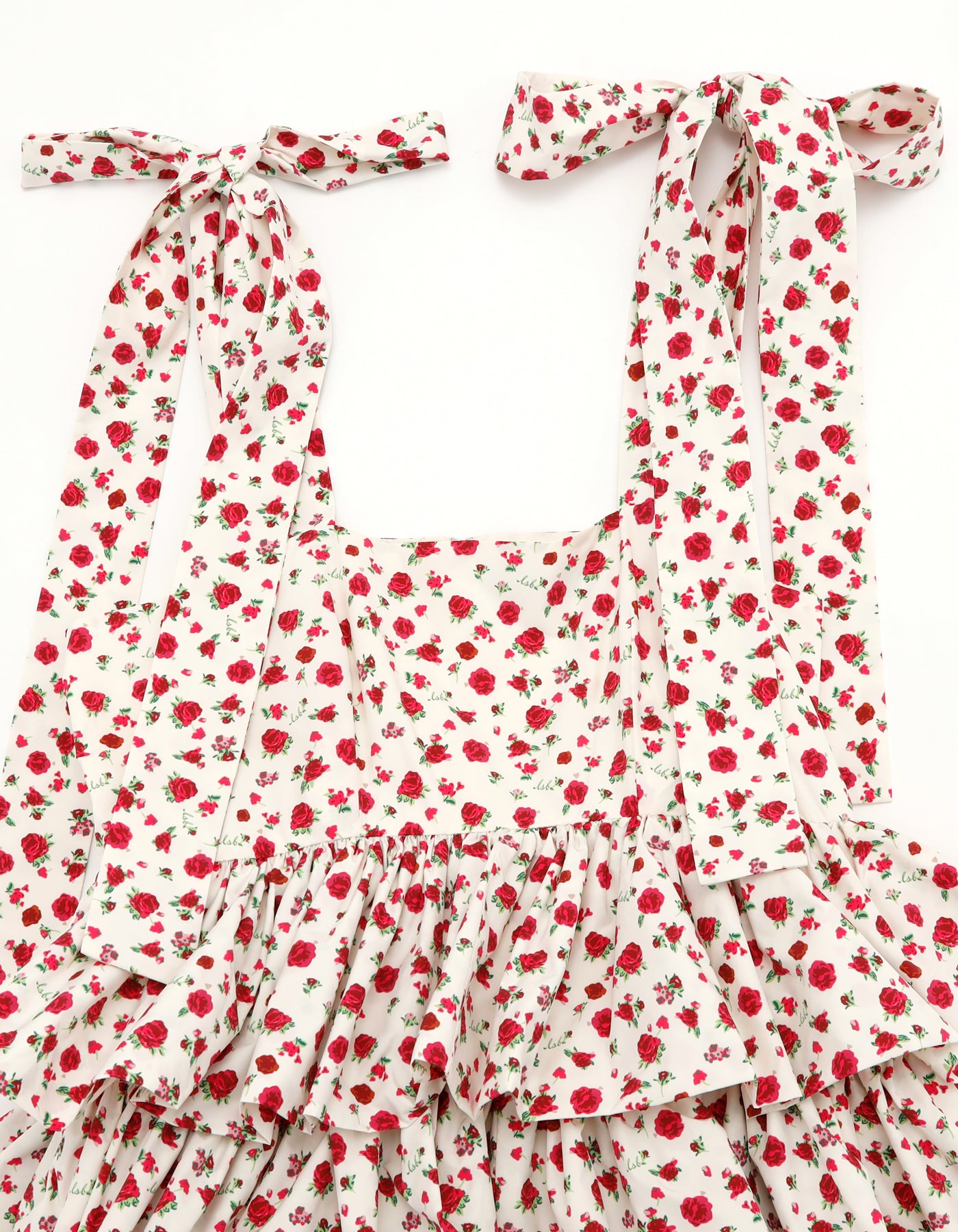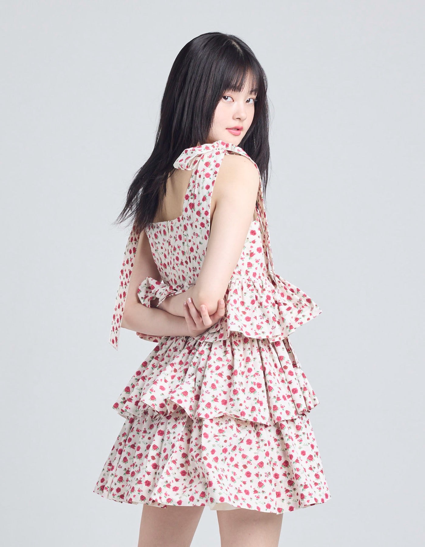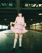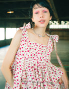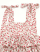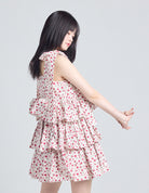 This tiered dress features an original rose pattern from little sunny bite. The three tiers of ruffles make it very cute, and the length can be adjusted with the shoulder straps.