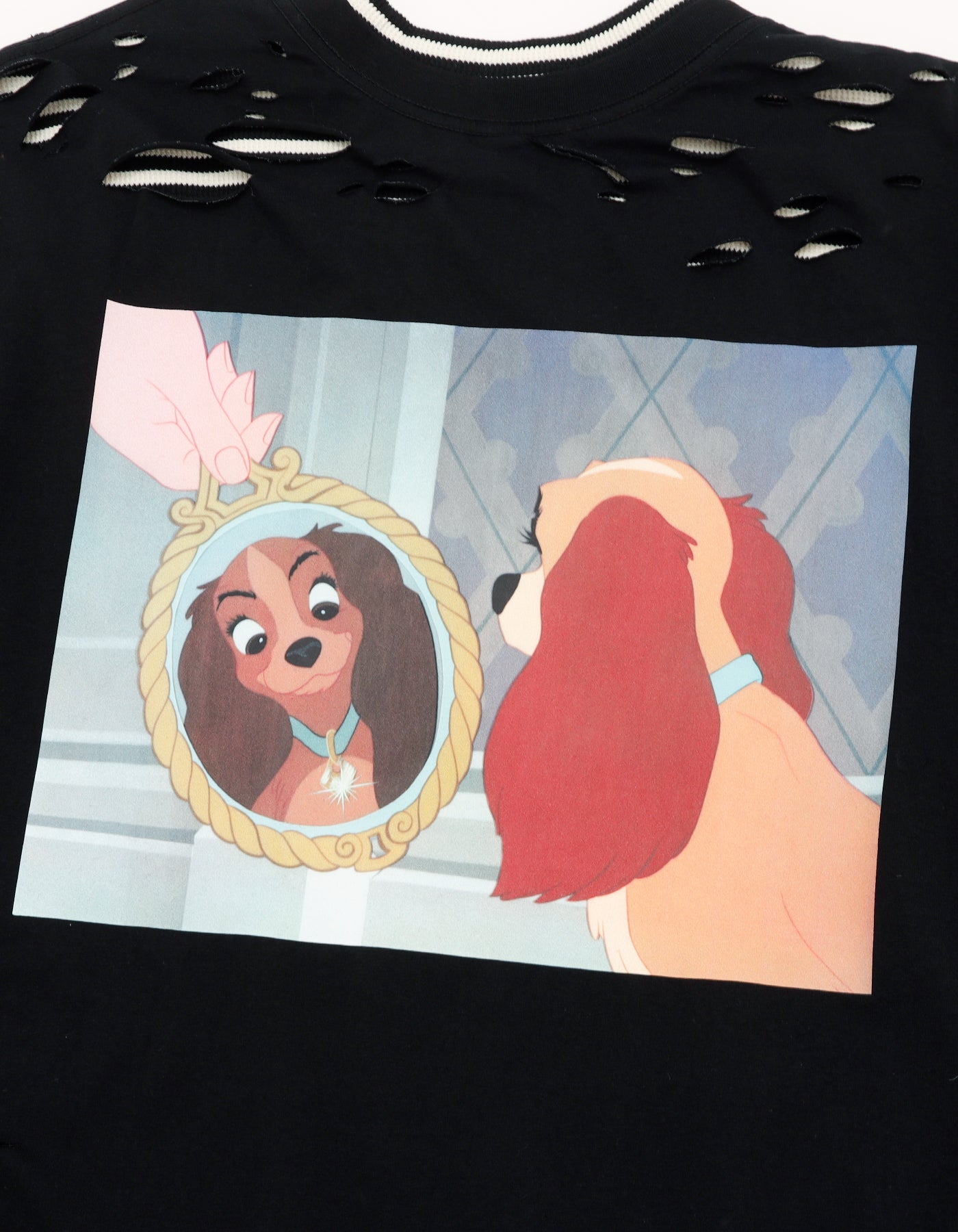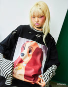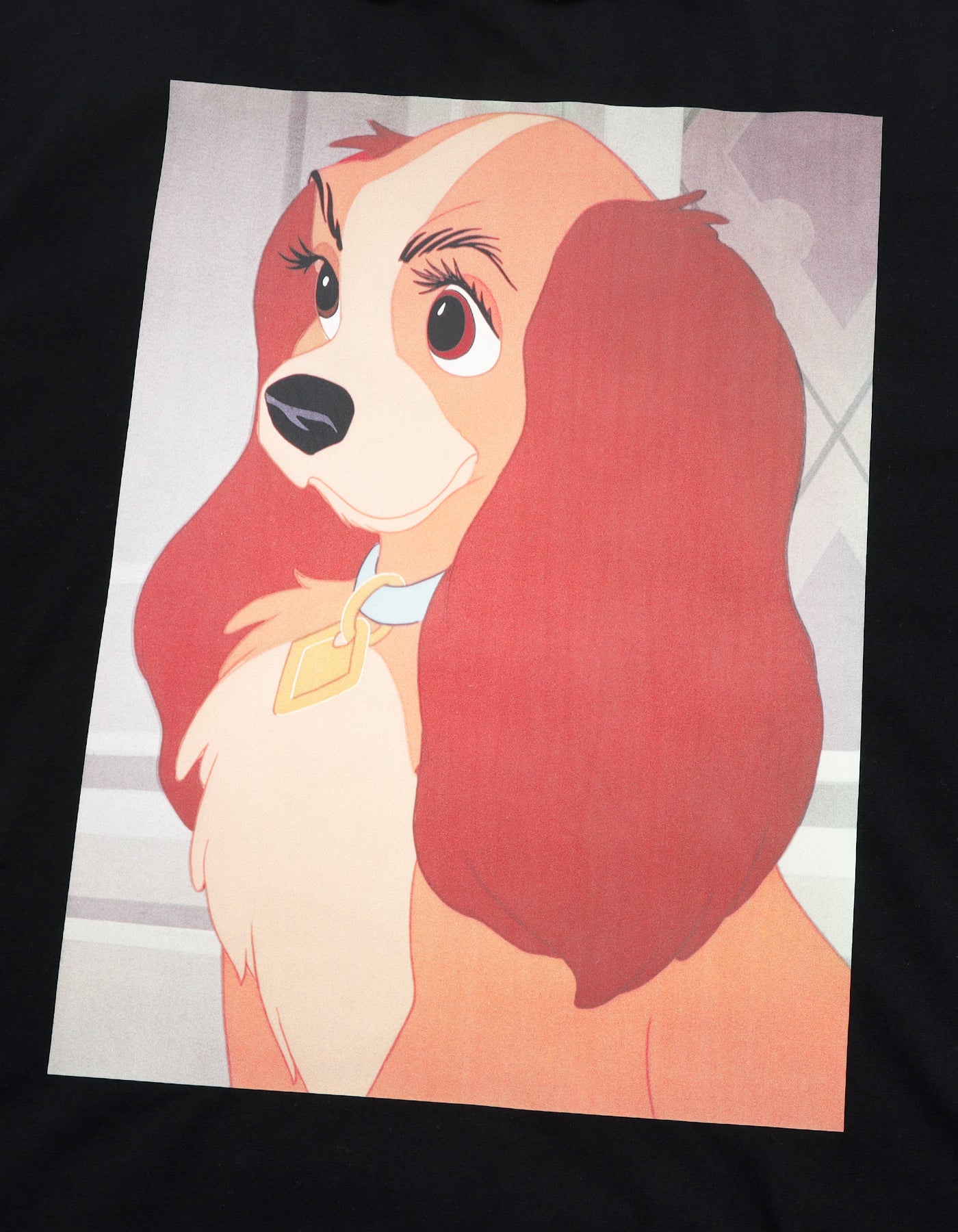 A layered-style long T-shirt with a large print of Lady from the 1955 classic "Lady and the Tramp" that makes a statement.